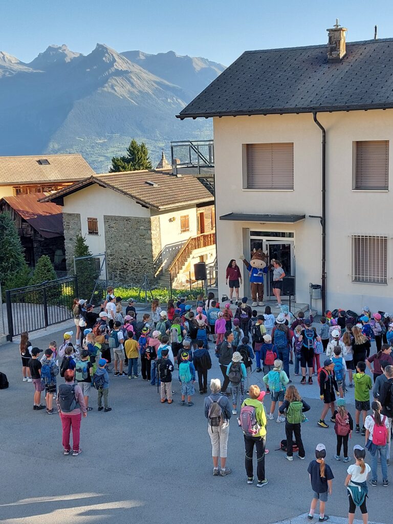 Qui dit Trivial Poursuite, dit compétition, équipes, et … prix. Les équipes étaient composées d’au moins un élève de chaque degré (de la 3H à la 8H), pour renforcer l’entraide entre les âges, ce qu’ils ont tous parfaitement réussi. Pour les prix, nous avons pu compter sur la générosité de la Commune de Nendaz et de l’Office du Tourisme, qui a aussi fait venir Cheesy pour l’échauffement au grand plaisir des enfants.