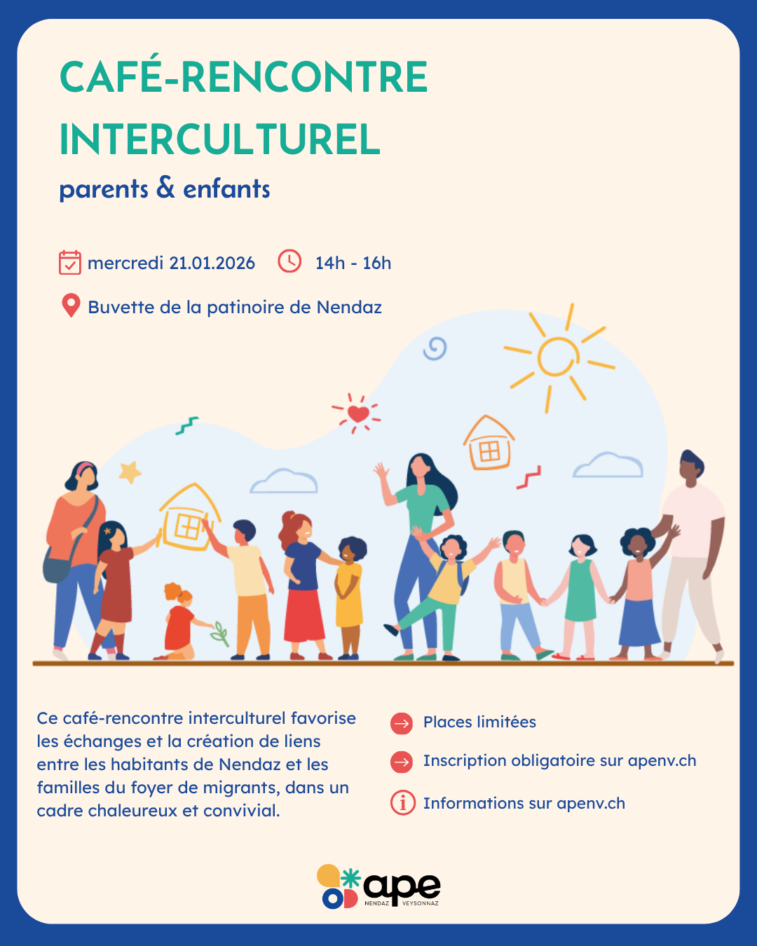Ce café-rencontre a pour but de favoriser les échanges, la découverte mutuelle et la création de liens entre les habitants de Nendaz et les familles (parents et enfants) du foyer de migrants.